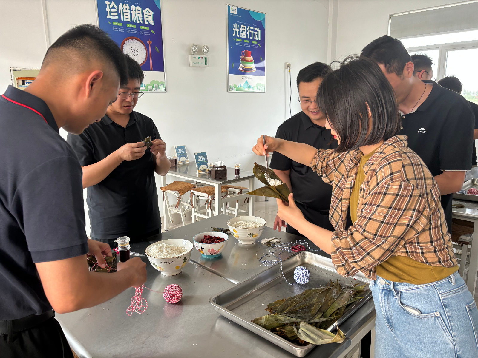 在一片祥和的節(jié)日氛圍中,大家圍攏在桌旁,邊學邊練,互相協(xié)作,折粽葉、填糯米裹葉子、扎線.......一道道工序有條不紊,忙得不亦樂乎一張張翠綠的粽葉在手中翩翩起舞,一個個有模有樣的粽子迅速成型,大家手把手傳承著端午節(jié)的傳統(tǒng)文化,共同感受著中華傳統(tǒng)文化的魅力。