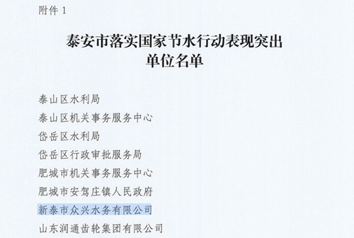 近日,新泰市眾興水務(wù)有限公司在落實國家節(jié)水行動和化工園區(qū)供水業(yè)務(wù)中表現(xiàn)突出,榮獲兩項榮譽稱號。
