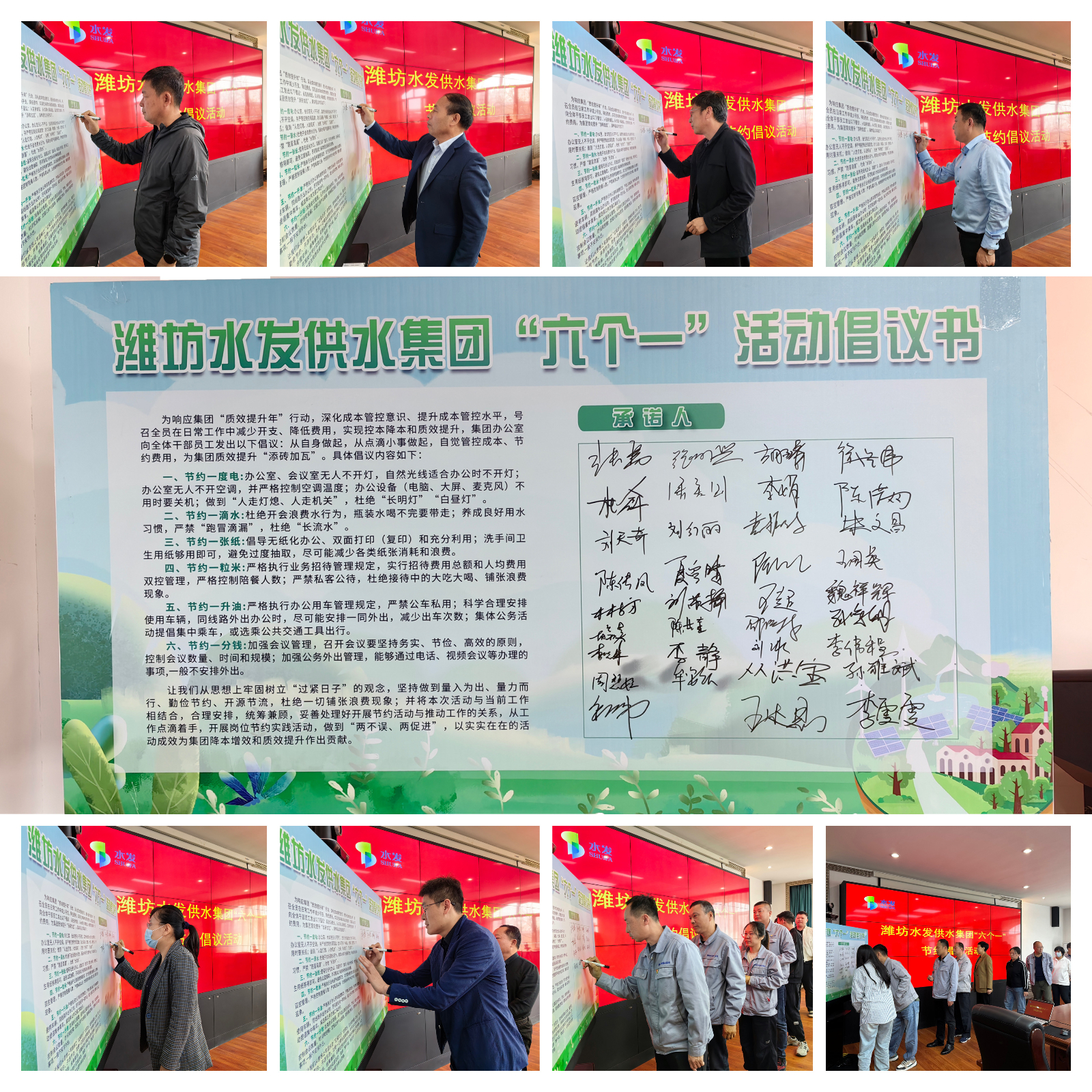 會上,供水集團(tuán)黨總支書記、董事長張勇首先宣讀了“六個一”活動倡議書,號召全體員工提升降本增效意識,爭做勤儉辦公、節(jié)能降耗的先進(jìn)模范。隨后,供水集團(tuán)領(lǐng)導(dǎo)班子成員及參加活動的干部職工紛紛在活動展板上簽上自己的名字,承諾自覺踐行“六個一”節(jié)約倡議。